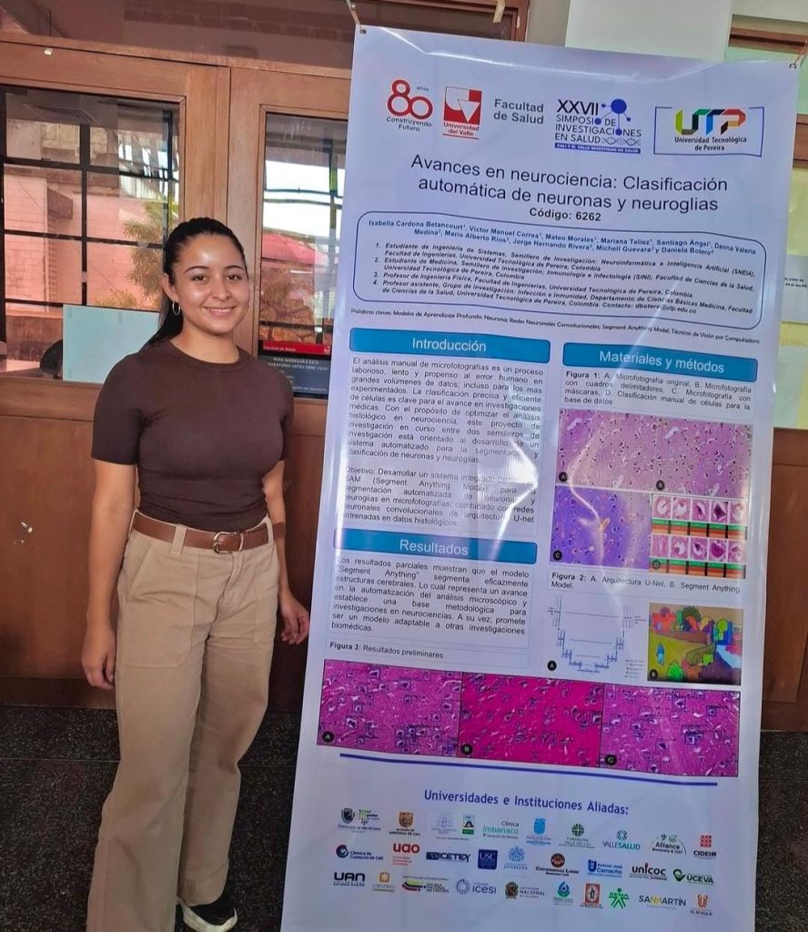 Isabella Cardona, estudiante del pregrado de ingeniería de Sistemas. Póster titulado «Avances en neurociencia: Clasificación automática de neuronas y neuroglias». Autores: Isabella Cardona Betancourt, Víctor Manuel Correa, Mateo Morales, Mariana Tellez, Santiago Ángel, Danna Valeria Medina, Mario Alberto Rios, Jorge Hernando Rivera, Michell Guevara y Daniela Botero-González. XXVI Simposio de Investigaciones en Salud 2025, Universidad del Valle, Cali.