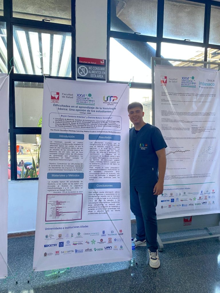 Bryan Cardona, estudiante del pregrado de Medicina. Póster titulado «Dificultades en el aprendizaje de la histología básica: Una opinión de los estudiantes». Autores: Bryan Cardona y Daniela Botero-González. XXVI Simposio de Investigaciones en Salud 2024, Universidad del Valle, Cali.