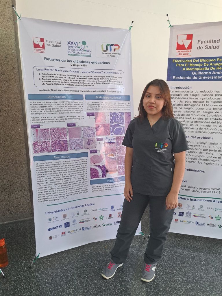 Valeria Cifuentes, estudiante del pregrado de Medicina. Póster titulado «Retratos de las glándulas endocrinas». Autores: Luisa Roche, María José Grajales, Valeria Cifuentes y Daniela Botero-González. XXVI Simposio de Investigaciones en Salud 2024, Universidad del Valle, Cali.