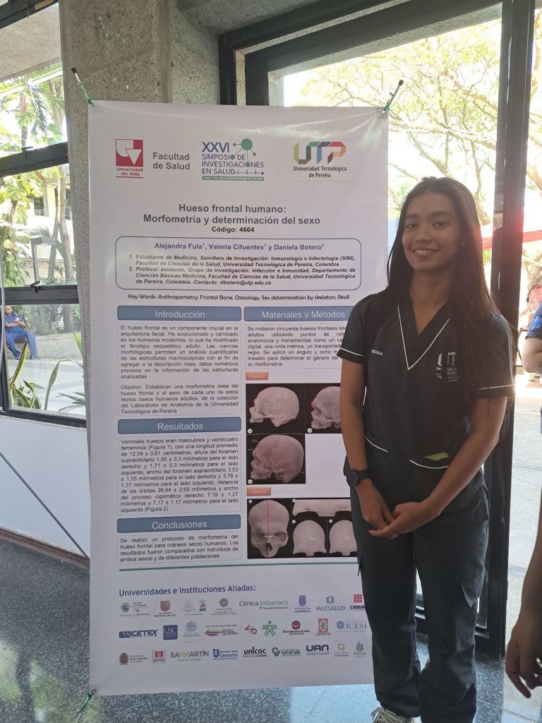 Alejandra Fula, estudiante del pregrado de Medicina. Póster titulado «Hueso frontal humano: Morfometría y determinación del sexo». Autores: Alejandra Fula, Valeria Cifuentes y Daniela Botero-González. XXVI Simposio de Investigaciones en Salud 2024, Universidad del Valle, Cali.