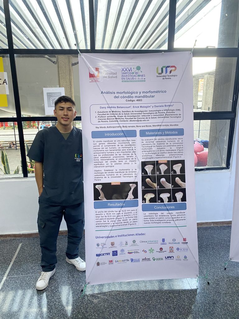 Dany Andrés Betancourt, estudiante del pregrado de Medicina. Póster titulado «Análisis morfológico y morfométrico del cóndilo mandibular». Autores: Dany Andrés Betancourt, Erick Malagón y Daniela Botero-González. XXVI Simposio de Investigaciones en Salud 2024, Universidad del Valle, Cali.