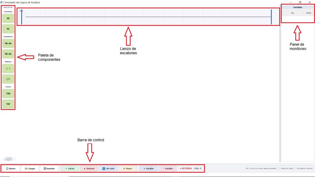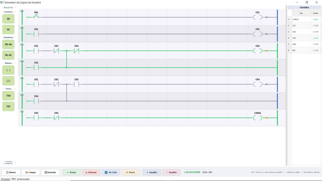 A través de una interfaz gráfica de usuario (GUI), el software permite la construcción interactiva de circuitos mediante la manipulación de componentes fundamentales como contactos normalmente abiertos (NA), normalmente cerrados (NC), bobinas y temporizadores industriales (TON y TOF). Asimismo, el sistema incorpora un motor de simulación que emula el ciclo de barrido de un PLC, evaluando de manera secuencial cada escalón del diagrama y actualizando el estado de las variables en tiempo real.