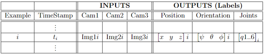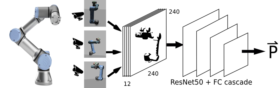 Para entrenar el sistema, se creó una base de datos simulada utilizando ROS, Gazebo y un modelo de un brazo UR5. Se situaron 3 cámaras RGBD en posiciones fijas apuntando hacia el brazo. Mediante muestreo de Montecarlo se generaron poses aleatorias del brazo dentro de su espacio de trabajo. Para cada pose generada, se guardaron las imágenes RGB y de profundidad de las 3 cámaras.