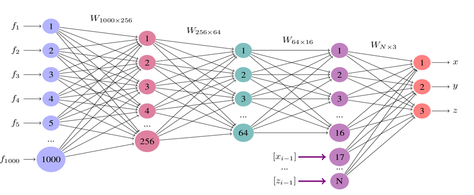 Luego, este vector de características se pasa a través de una cascada de redes neuronales totalmente conectadas, donde cada red predice las coordenadas 3D [x, y, z] de una de las articulaciones del brazo robótico. En total se tienen 6 redes neuronales totalmente conectadas en cascada, una para cada articulación.